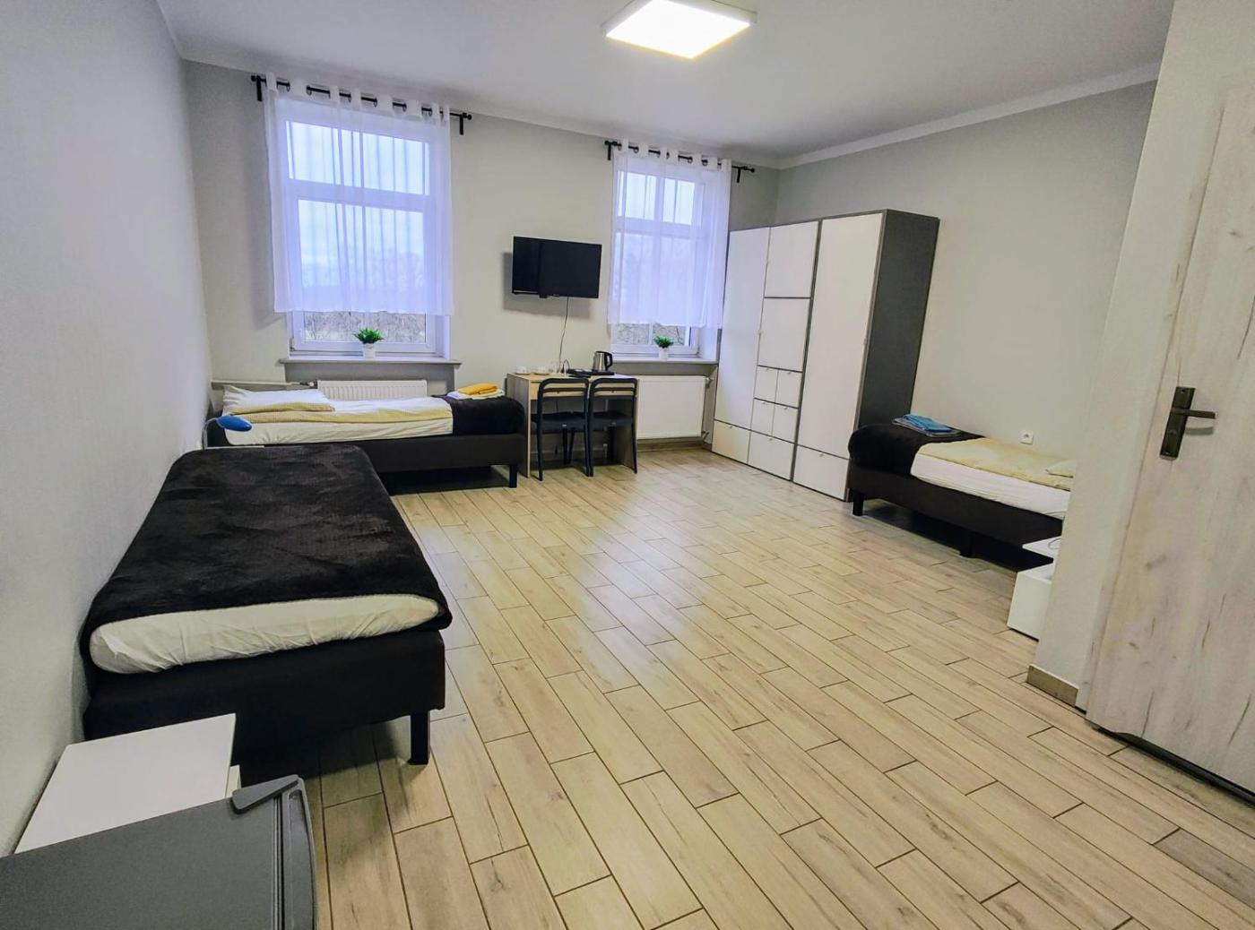 Pokój Trzyosobowy z prywatną łazienką. This triple room has a private bathroom, a tea and coffee maker, a wardrobe as well as a terrace. The unit has 3 beds. Pokój Trzyosobowy - 4 osobowy. Powierzchnia pokoju ok.: 30 mkw. ;