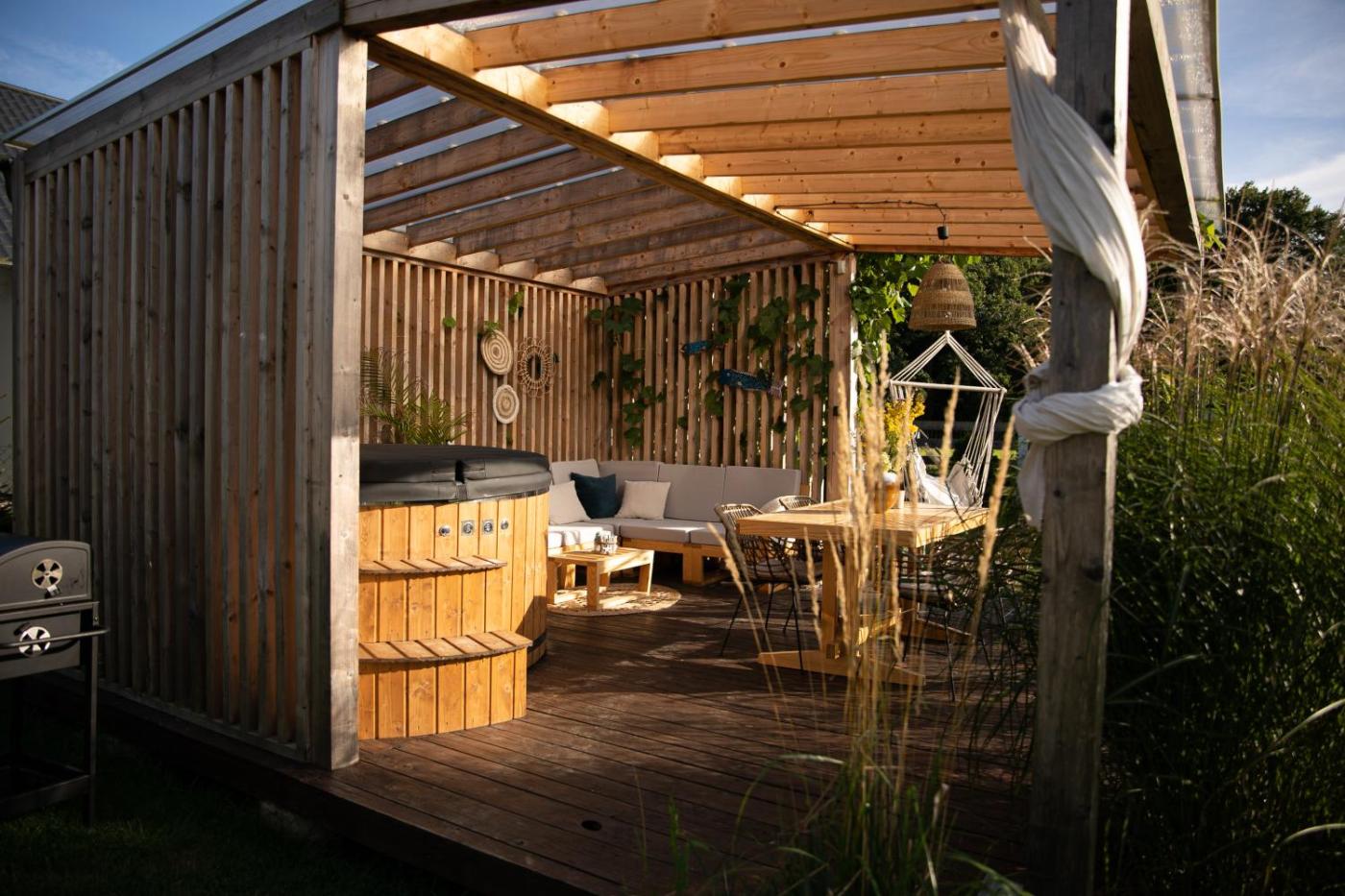 Dom wakacyjny. Guests will have a special experience as this holiday home offers a private pool, a hot tub and a fireplace. Featuring a private entrance, this holiday home also comprises 1 living room, 2 separate bedrooms and 1 bathroom with a shower. Guests will find a stovetop, a refrigerator, a dishwasher and kitchenware in the well-equipped kitchen. The holiday home also provides guests with a barbecue. Boasting a terrace with garden views, this holiday home also provides a washing machine and a flat-screen TV. The unit offers 4 beds. Dom wakacyjny - 5 osobowy. Powierzchnia pokoju ok.: 55 mkw.